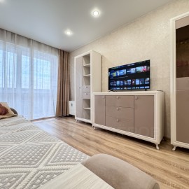 Новая квартира, косметический ремонт, напольное покрытие: керамическая плита в санузле, в гостиной ламинат. Квартира с мебелью и бытовой техникой: Кухонный гарнитур, диван, стол обеденный раздвижной, кресло-кровать, комод, шкаф-купе, холодильник, стиральная машина,...
