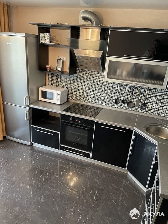 Полностью оборудованная кухня: холодильник, плита с 4 конфорками, духовка, микроволновка, электрический чайник, небольшой набор посуды.