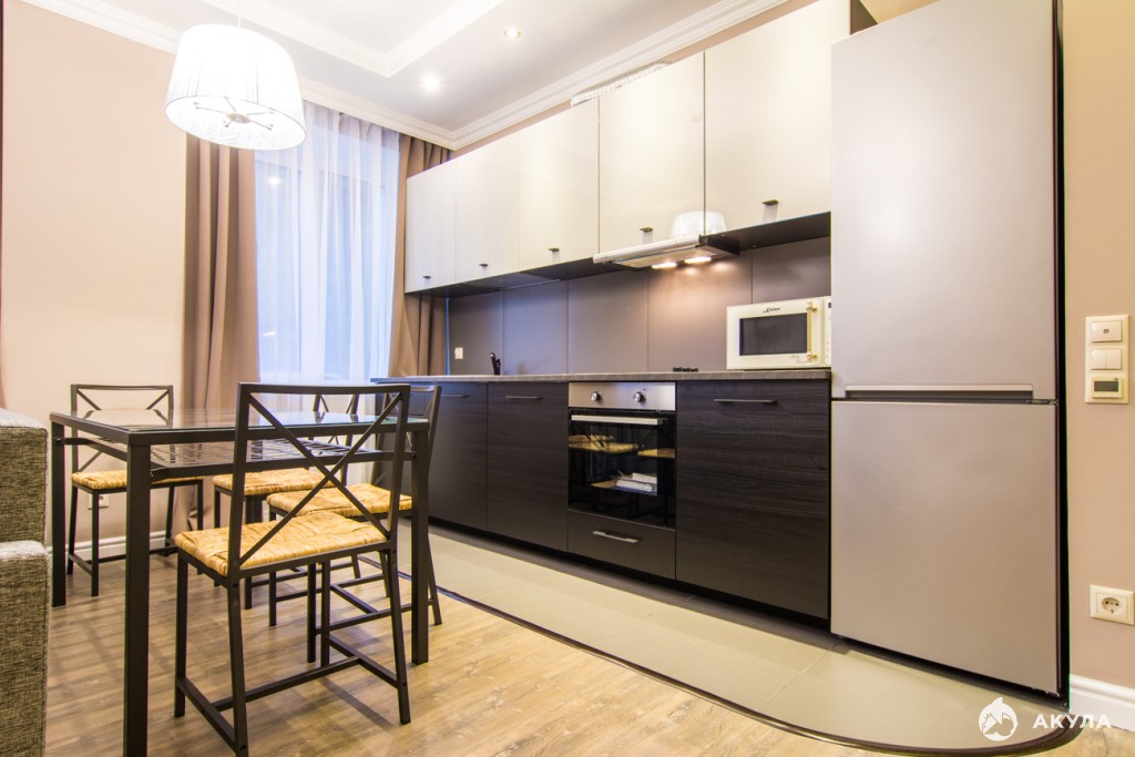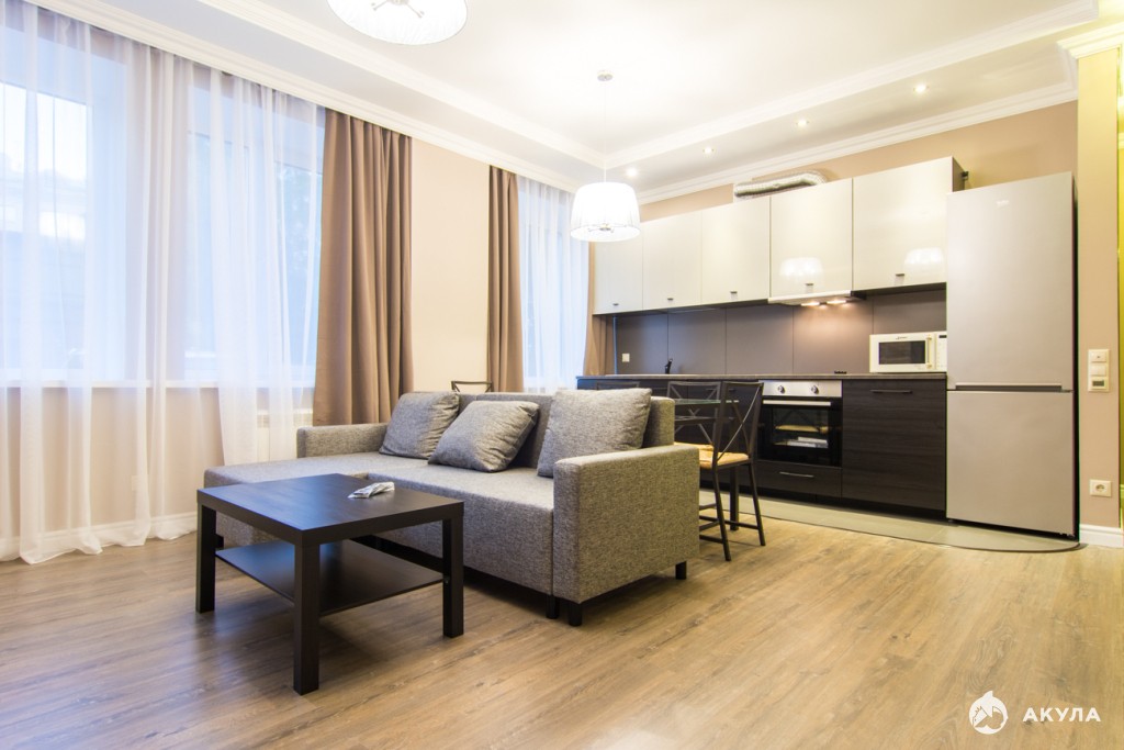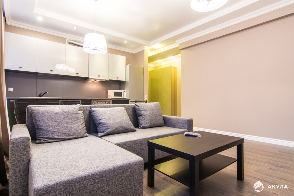 Мебель: удобный раскладной диван в гостиной, журнальный столик, обеденная группа на 4 персоны, дорогой встроенный кухонный гарнитур; большая двуспальная кровать в спальной, комплект прикроватных тумбочек, комод, шкаф с продуманной системой хранения вещей; шкаф в прихожей.