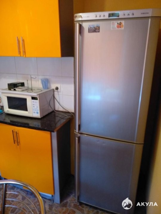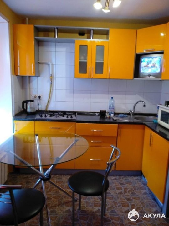 Полностью оборудованная кухня: холодильник, плита с 4 конфорками, духовка, микроволновка, электрический чайник, небольшой набор посуды.
